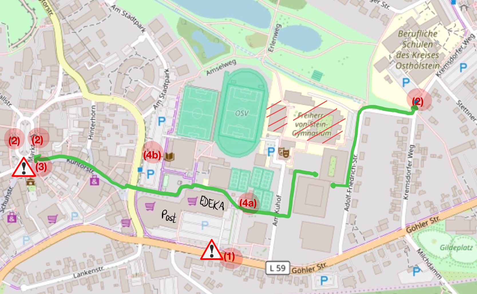 - Göhler Str. (L 59): Bei der Einfahrt zum Edeka-Parkplatz ist auf die Vorfahrtsregelung zu achten (1).